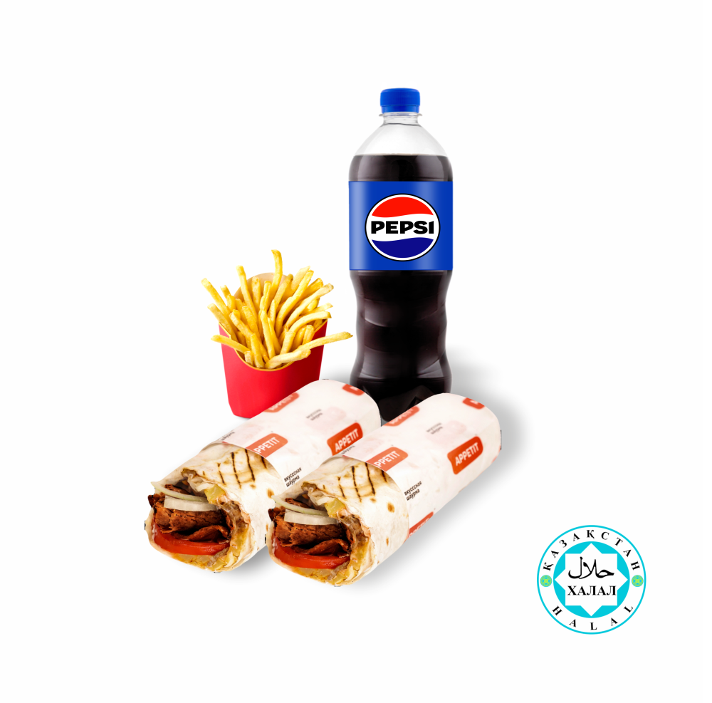 В комбо: 2 фирменные средние шаурмы, порция фри и напиток на выбор. Отличный вариант на двоих.